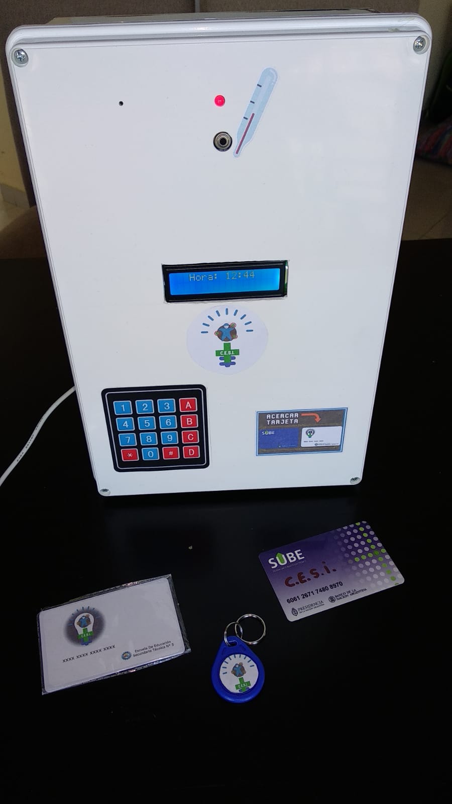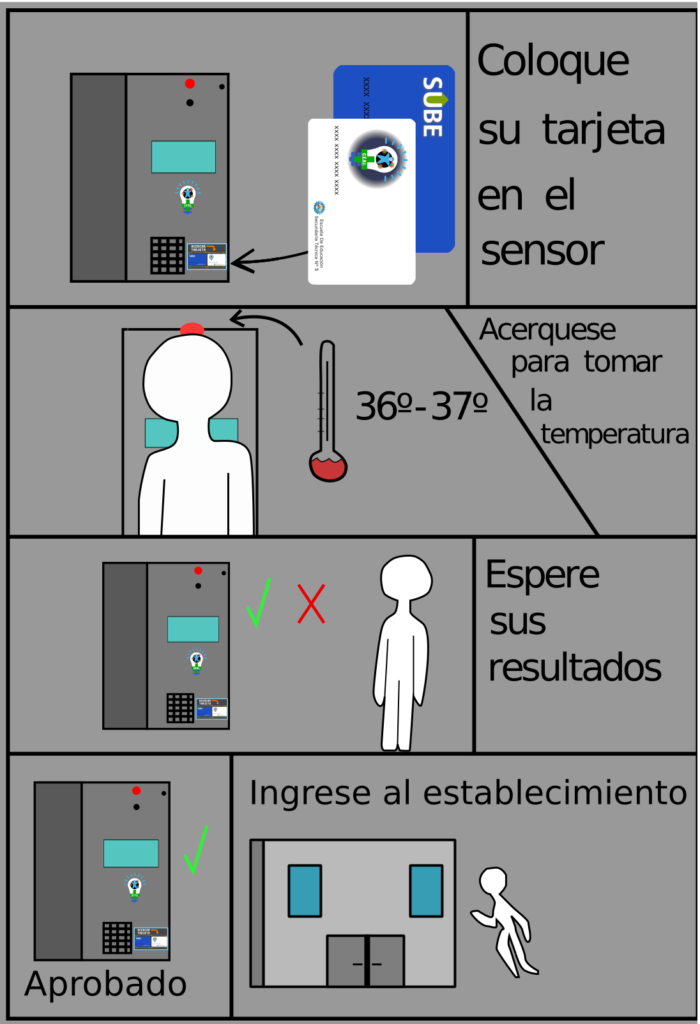 Dispositivo que permite medir la temperatura corporal del alumno al ingresar. Registra la asistencia diaria utilizando la tarjeta Sube. Brinda datos de manera online sobre su Ficha de Salud. Permite cumplir con los protocolos para evitar el Covid-19 y otras enfermedades.